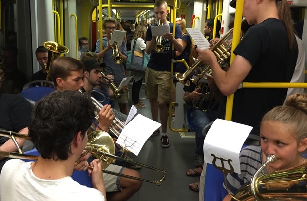 Es war der passende Song zum warmen Sommerabend: "Summer Nights" intonierte das Blechbläser-Ensemble der Ludwig van Beethoven Musikschule Bonn am frühen Montagabend in der Stadtbahn-Linie 5. Es war das zweite Konzert in der Reihe "Musik in der Bahn", die die KVB anlässlich ihres 140-jährigen Bestehens gestartet hat. Die jungen Musiker, die auch noch das schwungvolle "YMCA" spielten, boten in der für sie ungewohnten Umgebung einen professionellen Auftritt und bekamen dafür reichlich Applaus von den Fahrgästen.