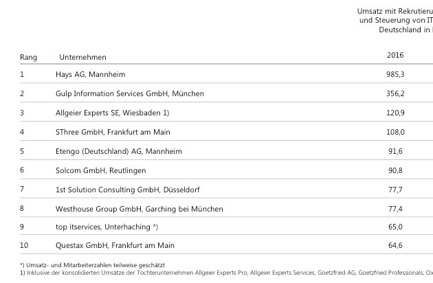 Die Allgeier Experts Group gehört auch in diesem Jahr zu den drei führenden IT-Personaldienstleistern. Zu diesem Ergebnis kommt die neueste Lünendonk-Marktsegmentstudie "Der Markt für Rekrutierung, Vermittlung und Steuerung von IT-Freelancern in Deutschland". Im jährlichen Branchenbarometer des Analystenhauses Lünendonk werden die marktführenden Anbieter nach Umsatz und Mitarbeiterzahl aufgelistet. Mit 258,5 Millionen Euro Gesamtumsatz und 1.819 Mitarbeitern konnte die Allgeier Experts Group 2016 ihr Geschäftsvolumen in Deutschland erneut signifikant steigern. Mit der Rekrutierung und Vermittlung von IT-Freelancern erwirtschaftete Allgeier Experts im abgelaufenen Jahr rund 121 Millionen Euro. Größte Treiber waren dabei Digitalprojekte. Auf Kundenseite steigt parallel dazu die Nachfrage nach ganzheitlichen Personallösungen.