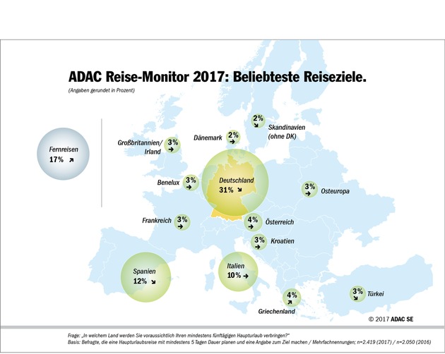 Bei den Reisezielen der Haupturlaubsreise ist Deutschland mit 31 Prozent weiter unangefochtener Spitzenreiter, gefolgt von Spanien (12,4 Prozent) und Italien (10,4 Prozent). Ein Comeback als Destination erlebt Griechenland: Planten 2016 nur 2,1 Prozent einen Urlaub in dem krisengeschüttelten Land, sind es 2017 mit 4,2 Prozent doppelt so viele Reisende. Auch Fernreisen sind dieses Jahr deutlich gefragter: 17 Prozent (Vorjahr: 14 Prozent) wollen ihren Urlaub außerhalb Europas verbringen.