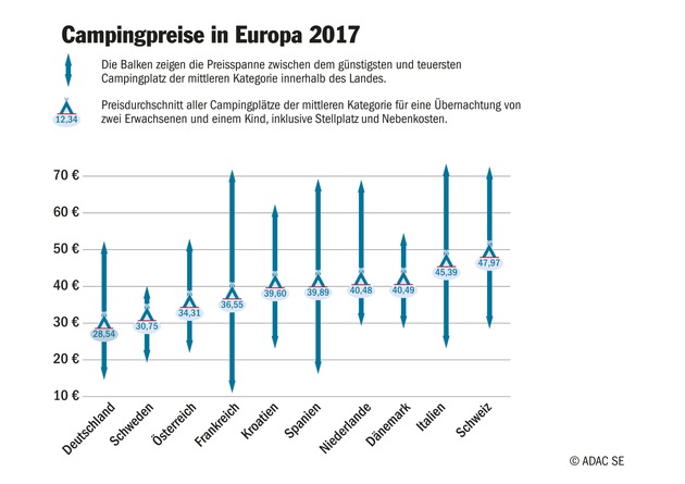 Zwei Erwachsene mit einem zehnjährigen Kind zahlen in der Sommer-Hauptsaison 2017 durchschnittlich 35,70 Euro für eine Übernachtung auf einem europäischen Campingplatz der mittleren Kategorie. Das sind etwa zwei Prozent mehr als 2016, wie aus einem Preisvergleich des ADAC Campingführers 2017 der ADAC Verlag GmbH & Co. KG hervorgeht. Im Vergleichspreis enthalten sind der Auto- und der Caravan-Standplatz sowie die wichtigsten Nebenkosten wie Strom, Warmduschen und die Kurtaxe.