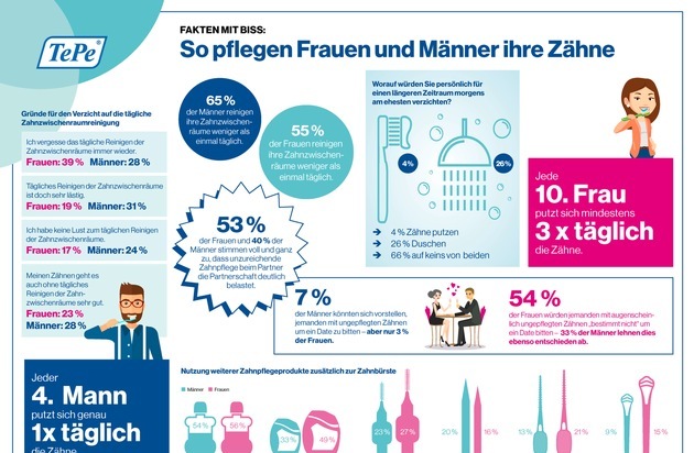 Joachim Lafrenz, General Manager bei TePe, resümiert: "Es gibt die Tendenz, dass Frauen ein etwas größeres Engagement bei der Zahnpflege zeigen. Aber die Unterschiede zwischen Männern und Frauen sind - zumindest was die Mundhygiene angeht - eher gering. Deutlich wird jedoch, dass eine Aufklärung über Mundgesundheit dringend notwendig bleibt. Unsere Kampagne mit Jürgen Vogel, die sich auf die Zahnzwischenraumpflege fokussiert, ist ein wirkungsvoller Anfang. Denn sowohl unsere als auch andere Erhebungen, wie die Fünfte Deutsche Mundgesundheitsstudie, zeigen zwar Fortschritte, aber es existiert offenbar noch ein großer Aufklärungsbedarf. Dabei unterstützen wir bei TePe gern."