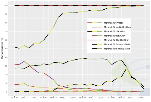 Auch bei den möglichen Regierungskoalitionen erwies sich das Prognosetool als treffsicher. Im neu gewählten Bundestag besitzen die folgenden Koalitionen eine rechnerische Mehrheit: Die "GroKo" (Schwarz-Rot) mit 399 sowie "Jamaika" (Schwarz-Grün-Gelb) mit 393 Sitzen von insgesamt 709 Sitzen. Schwarz-Gelb erhält gemeinsam lediglich 326 von nötigen 355 Sitzen, Schwarz-Grün schafft es nur auf 313 Sitze, die Ampelkoalition (Rot-Gelb-Grün) auf 300 Sitze, Rot-Rot-Grün auf 289 Sitze und Rot-Grün auf 220 Sitze. Abseits der GroKo und Jamaika sind die übrigen Koalitionsoptionen weit entfernt von einer rechnerischen Mehrheit im Bundestag. Das Wahlprognosemodell von INWT hat eine rechnerische Mehrheit der Großen Koalition im Bundestag bereits im März mit einer Wahrscheinlichkeit von über 99 Prozent vorhergesagt. Diese Wahrscheinlichkeit hat sich in den folgenden sechs Monaten bis zur Wahl kaum verändert. Auch die Wahrscheinlichkeit für eine rechnerische Mehrheit für Jamaika war durchgängig hoch und steigerte sich im Verlauf von ca. 50 bis 60 Prozent auf nahezu 100 Prozent vor der Wahl. Die Wahrscheinlichkeiten für eine schwarz-gelbe oder eine schwarz-grüne Regierungskoalition rangierten seit März 2017 bei ca. 1 bis 27 Prozent für Schwarz-Gelb bzw. bei ca. 5 bis 38 Prozent für Schwarz-Grün. Der Ampelkoalition, Rot-Grün und Rot-Rot-Grün gaben die Predictive Analytics-Experten von INWT Statistics lediglich in der Hochphase des Schulz-Hypes eine geringe Chance, zustande zu kommen.