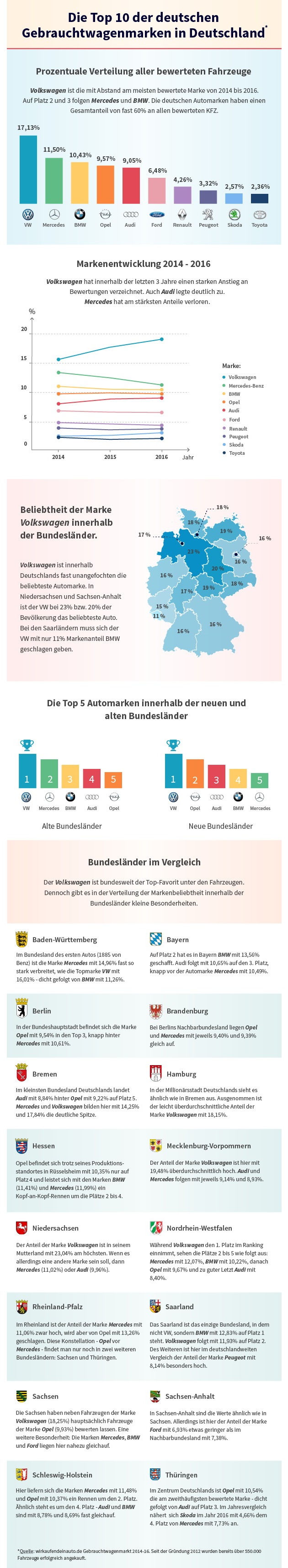 Stellt man in einem weiteren Schritt die Daten aller Bundesländer gegenüber, lassen sich weitere Besonderheiten erkennen. So ist beispielsweise der Anteil an Peugeots im Saarland überdurchschnittlich hoch und in Thüringen wurde in den letzten zwei Jahren die Marke Skoda so oft bewertet, dass sie mittlerweile schon unter den Top 5 im Ranking liegt. Diese Zahlen sind der Nähe zu den entsprechenden Herstellerländern - Frankreich bzw. Tschechien - geschuldet. Zudem zeigt sich, dass in den Bundesländern Rheinland-Pfalz, Sachsen und Thüringen mehr Fahrzeuge der Marke Opel bewertet wurden als von Mercedes-Benz.