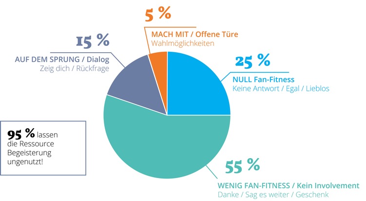 Die meisten Unternehmen (55 Prozent) bedanken sich in dem Test herzlich für das Kompliment. Doch sie wissen mit dem Engagement nichts weiter anzufangen. Nur 5 Prozent sind wirklich fit für Fans: Sie bieten Aktionen für Unterstützer an und öffnen die Tür für Engagement.