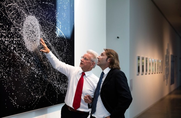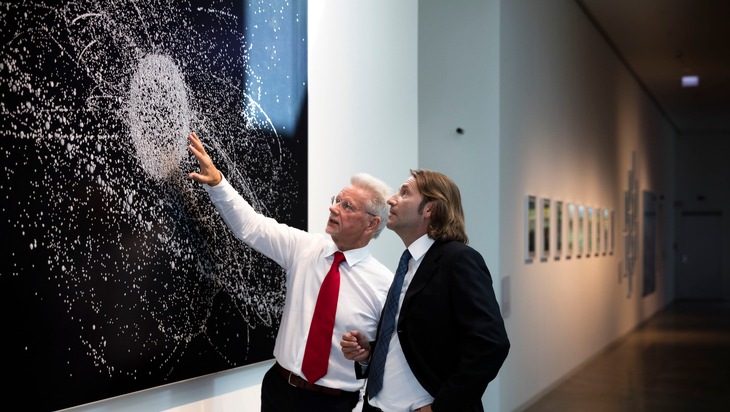 Dr. Christian Abegglen (rechts) im Gespräch mit Dr. Manfred Wittenstein (links) im Foyer der WITTENSTEIN Innovationsfabrik, vor einem Werk des deutschen Fotokünstlers Michael Najjar. Bildquelle: WITTENSTEIN SE