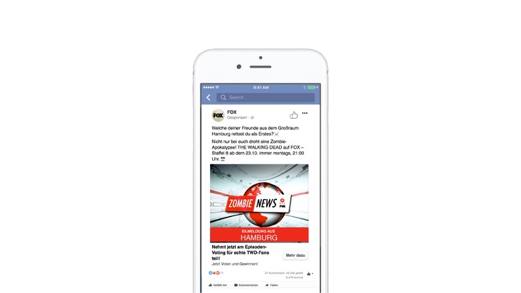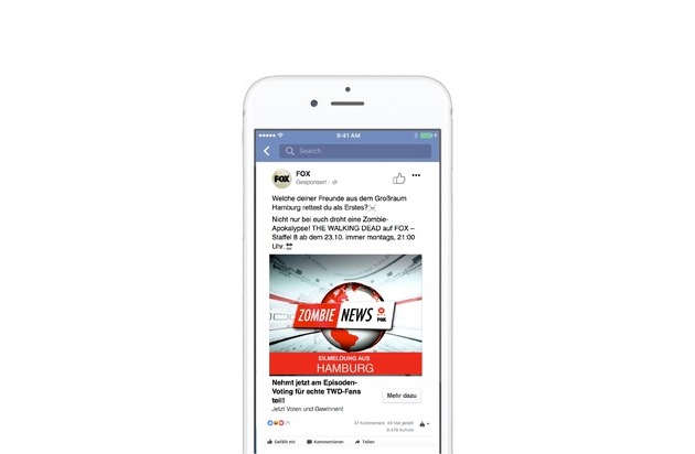 13. Oktober 2017 - Die "Zombie News" überraschen die User auf den Facebook-Seiten von FOX und RTL II. Die Video-Ads werden nach Wohnort individuell gestaltet und ausgespielt. Die in dem "Nachrichtenbeitrag" genannte Region wird automatisch angepasst. Die Kampagne deckt auf diese Weise mehr als 250 Städte und Gemeinden in Deutschland ab. Darüber hinaus fordern die Anzeige und redaktionelle Posts die Nutzer auf zu entscheiden, welche ihrer Freunde sie als erstes retten würden. Dieser "Call to Action" sorgt für die virale Verstärkung der Kampagne.