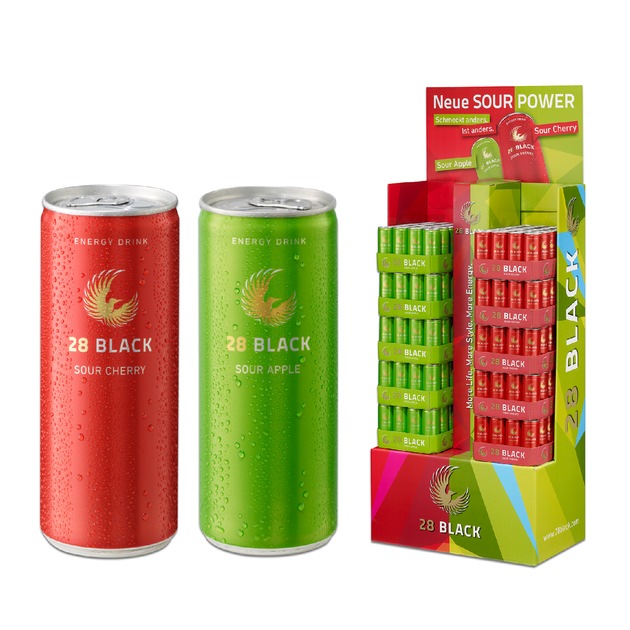 Der Energy Drink 28 BLACK erweitert seine Produktrange um die Geschmacksvariante "Sour". Gleich zwei neue Sorten werden ab Mitte Februar in der 28 BLACK-Familie begrüßt: 28 BLACK Sour Cherry und 28 BLACK Sour Apple bieten dem Konsumenten ein sauer-prickelndes Geschmackserlebnis mit Energie-Kick.