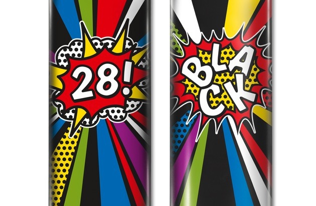 Auffallend. Kreativ. Neu. Die erste Limited Edition von 28 BLACK mit knalligen Farben im Pop Art Look ist ein absolutes Must-have. Zwei Motive, die nebeneinander gestellt den Markennamen 28 BLACK ergeben, sind ab 05. April nur für kurze Zeit und in limitierter Auflage im Handel erhältlich. In den Dosen - die Lieblingssorte der 28 BLACK Fans: Açaí. Und weil das so gut schmeckt, ist in der Edition Dose auch gleich mehr davon drin, nämlich 330 ml statt der üblichen 250 ml. Und wie immer fruchtig, ohne Taurin, vegan, gluten- und laktosefrei.