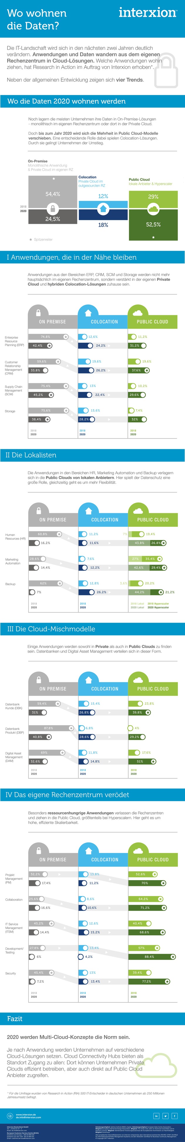 16. Mai 2018 - Welche IT-Infrastruktur kommt künftig für welche Daten und Anwendungen zum Einsatz? Welche Vorteile geben den Ausschlag, und welche Veränderungen sollten Entscheider jetzt einleiten? Das haben die Marktforscher von Research in Action im Auftrag von Interxion (INTERXION HOLDING NV; NYSE: INXN) untersucht*. Ihre Antworten ergeben ein klares Bild: Vom heutigen On-Premise-Schwerpunkt (36,8 Prozent beziehen ihre Anwendungen aus der Private Cloud im eigenen Rechenzentrum, 17,6 Prozent monolithisch aus dem eigenen RZ) werden die Daten bis 2020 zu großen Teilen Richtung Cloud wandern. 2020 wollen die Entscheider 27,9 Prozent ihrer Daten über Hyperscaler beziehen, 24,6 Prozent von lokalen Public-Cloud-Anbietern.