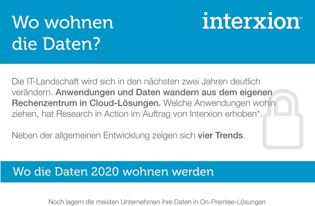 16. Mai 2018 - Welche IT-Infrastruktur kommt künftig für welche Daten und Anwendungen zum Einsatz? Welche Vorteile geben den Ausschlag, und welche Veränderungen sollten Entscheider jetzt einleiten? Das haben die Marktforscher von Research in Action im Auftrag von Interxion (INTERXION HOLDING NV; NYSE: INXN) untersucht*. Ihre Antworten ergeben ein klares Bild: Vom heutigen On-Premise-Schwerpunkt (36,8 Prozent beziehen ihre Anwendungen aus der Private Cloud im eigenen Rechenzentrum, 17,6 Prozent monolithisch aus dem eigenen RZ) werden die Daten bis 2020 zu großen Teilen Richtung Cloud wandern. 2020 wollen die Entscheider 27,9 Prozent ihrer Daten über Hyperscaler beziehen, 24,6 Prozent von lokalen Public-Cloud-Anbietern.