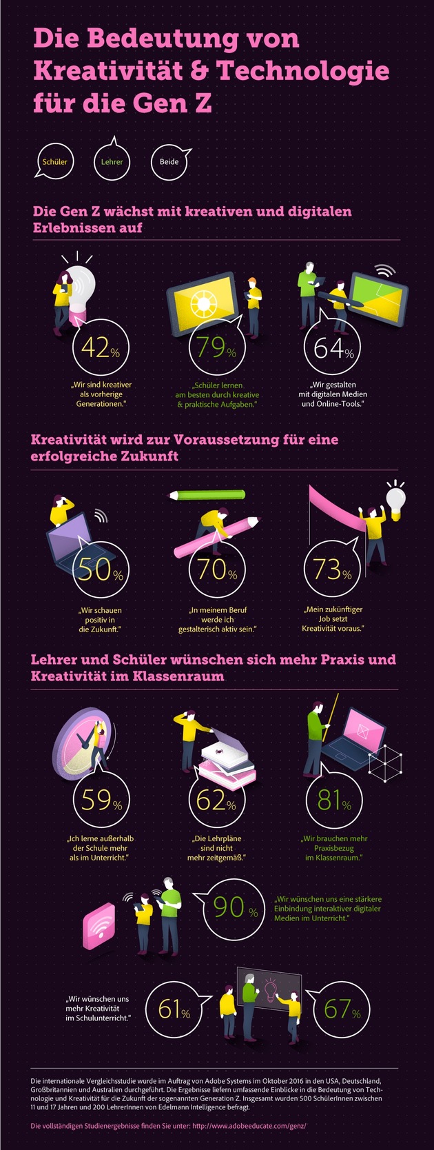 Mädchen und Jungen im Alter von 11 bis 17 Jahren wachsen in einer Welt voll permanenter Veränderungen auf, die sich fundamental von der ihrer Eltern und Großeltern unterscheidet. Wie können Lehrer sie auf die Herausforderungen von heute, morgen und übermorgen bestmöglich vorbereiten? Eine internationale Studie von Adobe gibt aufschlussreiche Einblicke in die Sichtweisen der sogenannten Generation Z. Mit welchen Erwartungen diese jungen Menschen ihrer Zukunft entgegen treten und welchen Stellenwert sie Kreativität und Technologie beim Lösen von Problemen beimessen, präsentiert Adobe auf der Bildungsmesse didacta 2017 vom 14. bis 17. Februar 2017 in Stuttgart. Am Stand in Halle 4 erfahren Messebesucher zudem in Workshops und Präsentationen, welche Schlussfolgerungen sich für die Unterrichts- und Berufspraxis daraus ableiten lassen.