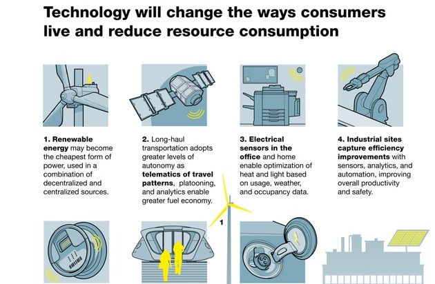 Die Studie zeigt: Von neuen Technologien werden vor allem Privathaushalte profitieren. Durch die effiziente und gesteuerte Nutzung von Strom, Heizung und Licht können Konsumenten weltweit ihre Kosten für den Energieverbrauch um bis zu 20 Prozent reduzieren. In Industrie und Wirtschaft könnte gleichzeitig die Energieproduktivität um bis zu 70 Prozent steigen. Die Folgen für die globale Wirtschaft sind positiv: Dem MGI zufolge sind - abhängig von Art und Umfang der zum Einsatz kommenden neuen Technologien - bis 2035 Einsparungen von bis zu 1,6 Billionen Dollar möglich.
