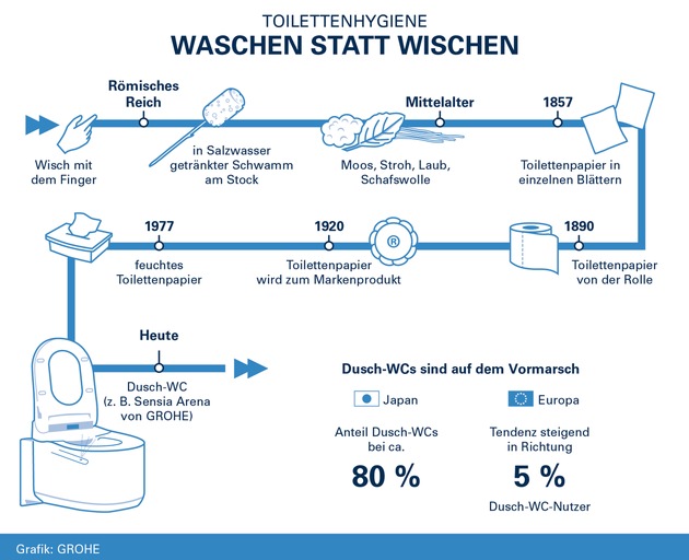 Die Römer nahmen die Finger zu Hilfe. Später tränkten sie kleine Schwämme in Salzwasser und befestigten sie an einem Stock. Im Mittelalter mussten Moos, Laub oder alte Lumpen herhalten. Wer wohlhabend war, konnte zu Schafswolle greifen. Keine Frage, das ursprüngliche "Toilettenpapier" ist weit von dem Hygieneartikel entfernt, den wir heute kennen und am 26. August mit dem "Internationalen Tag des Toilettenpapiers" würdigen. Doch die Hygienekultur ist nicht beim Papier stehen geblieben. Schon längst hat sie das nächste Level erreicht: "Waschen statt Wischen" lautet das neue Motto in der intimsten Körperpflege. Dieses neue Denken - ausgelöst wurde es durch die immer angesagteren Dusch-WCs - verändert die Welt.
