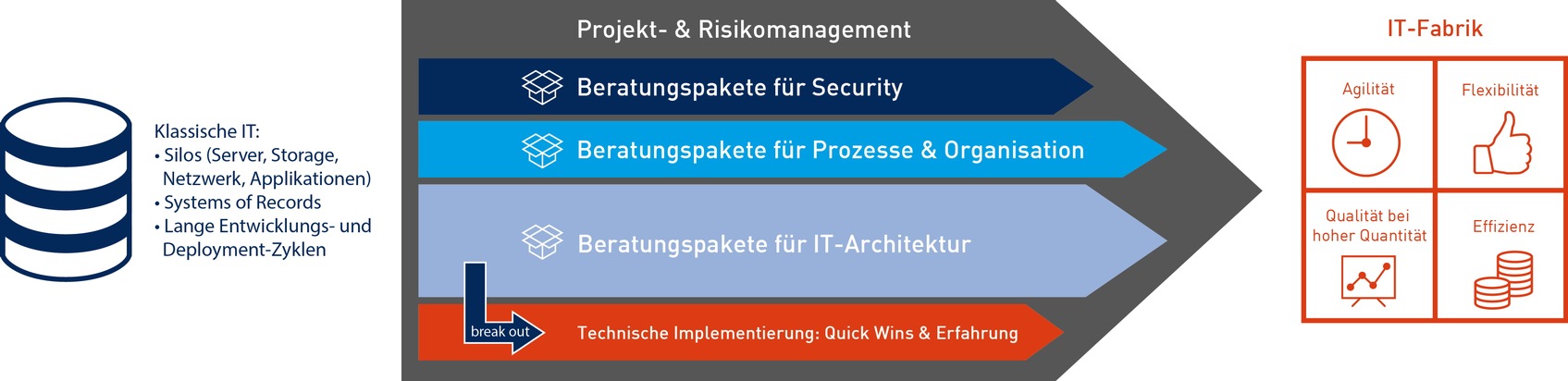 Ganz neu ist das technologieunabhängige Beratungspaket "Datacenter Transformation". Damit können CIOs Zeit, Kosten und Qualität ihrer Transformationsprojekte zielgenau abschätzen. Datacenter Transformation besteht aus mehreren vorkonfektionierten Einzelpaketen für die drei Bereiche Security, Prozesse und Organisation sowie IT-Architektur, die Materna technologieunabhängig analysiert. Alle Pakete sind nach Bedarf eigenständig einsetzbar und individuell buchbar oder lassen sich miteinander kombinieren. Als Ergebnis liefert Materna Handlungsempfehlungen für eine priorisierte Umsetzung von Maßnahmen für die Transformation der IT in eine IT-Fabrik.