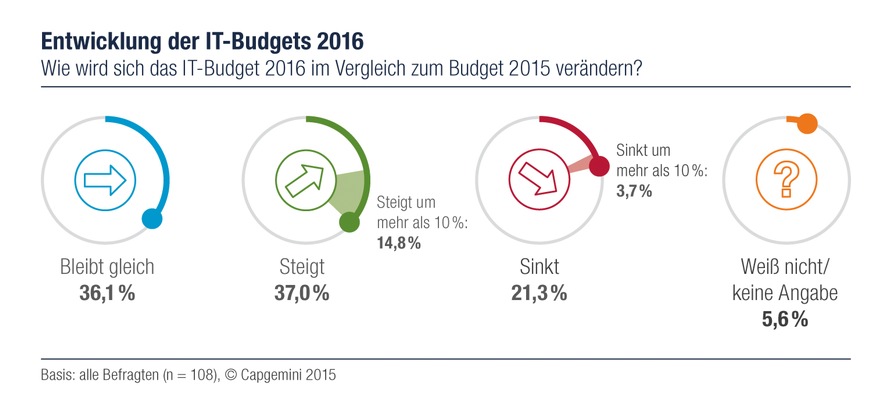 Im kommenden Jahr steigen die IT-Budgets bei 37,0 Prozent der Unternehmen, bei knapp 15 Prozent sogar im zweistelligen Bereich. Damit sind die Prognosen optimistischer als für das laufende Jahr, in dem einem Drittel der IT-Verantwortlichen mehr IT-Budget zur Verfügung stand. Der Anteil der CIOs, der 2016 von Kürzungen betroffen ist, steigt mit 21,3 Prozent nur leicht (2015 19,4 Prozent). Für 2017 rechnen mit 38,1 Prozent ähnlich viele CIOs mit höheren Investitionen wie im kommenden Jahr, während die Prognosen für 2018 verhaltener ausfallen. Die Angaben wurden im Rahmen der jährlichen IT-Trends-Studie im September und Oktober dieses Jahres von Capgemini erhoben. Insgesamt nahmen 153 IT-Verantwortliche von Großunternehmen in Deutschland, Österreich und der Schweiz teil, darunter 11 Firmen aus dem DAX-30. Die Gesamt-Auswertung der IT-Trends-Studie wird Anfang Februar 2016 veröffentlicht.