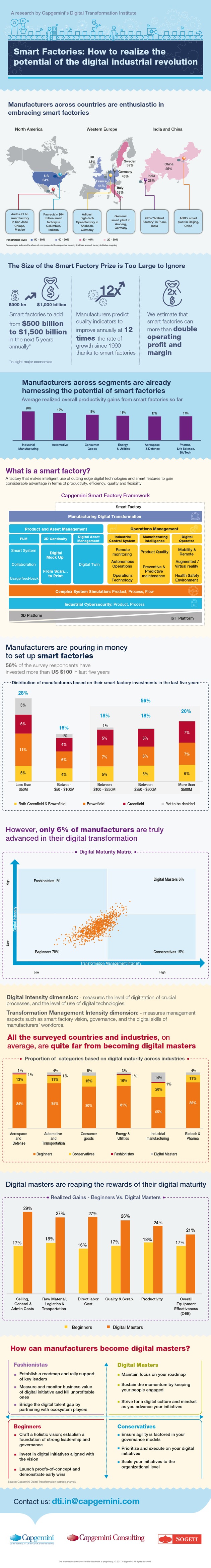 Offensivere Schätzungen gehen von bis zu 1.500 Milliarden USD zusätzlichem Wertbeitrag für die globale Wirtschaft aus Geld fließt in smarte Fabriken: Mehr als die Hälfte der Befragten (56 Prozent) haben in den letzten fünf Jahren 100 Millionen US-Dollar oder mehr in die Planung smarter Werke investiert, bei 20 Prozent der Befragten waren es sogar 500 Millionen US-Dollar oder mehr. Doch nach der Analyse des Digital Transformation Institute von Capgemini befindet sich nur ein kleiner Teil der Unternehmen (6 Prozent) im fortgeschrittenen Stadium der digitalen Produktion. Darüber hinaus gaben nur 14 Prozent der Befragten an, dass sie mit ihrem Erfolgslevel "zufrieden" seien.