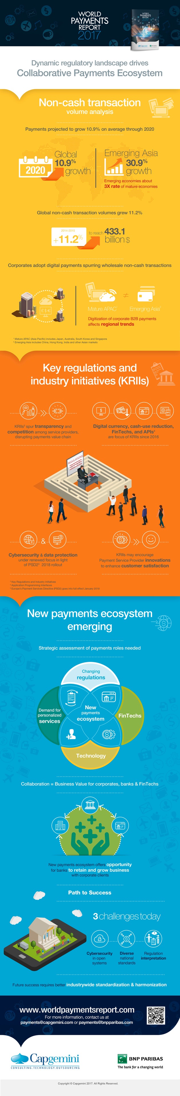 Der Report macht zentrale Regulierungs- und Brancheninitiativen, die auf Wettbewerb und Risikominderung ausgerichtet sind, für ein komplexes Regulierungsumfeld verantwortlich, da sie den Wettbewerb unter den Dienstleistern anregen und traditionelle Segmente der Wertschöpfungskette im Zahlungsverkehr stören. Allerdings haben diese Initiativen auch das Potenzial, die Standardisierung und Transparenz zu verbessern, wodurch sich für den Kunden wesentliche und langfristige Innovationen ergeben könnten. Die Richtlinien, die seit der Veröffentlichung des World Payments Report 2016 eingeführt wurden, konzentrieren sich auf digitale Währung und auf die Reduzierung von Bargeld, FinTechs sowie APIs.