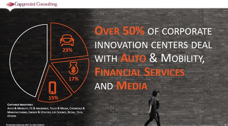Berlin bleibt mit vier im ersten Quartal 2017 neu eröffneten Innovationszentren unter den Top 10 Städten nach dem Silicon Valley, Singapur, London, Bangalore, Paris und Atlanta und liegt damit noch vor Boston und Shanghai. In Deutschland wuchs die Anzahl der unternehmenseigenen Innovationszentren insgesamt um 24 Prozent auf 78 Zentren. Die Studienautoren unterscheiden bei den Innovationszentren zwischen Labs, die bis zu einem halben Jahr bestehen und vor allem für Prototyping und Geschäftsmodellentwicklung genutzt werden, und Inkubatoren, die bis zu zwei Jahren über die Markteinführung bis hin zur Hochskalierung der Ideen bestehen. Dritte Kategorie sind die sogenannten Acceleratoren, die mit Markteinführung über einige Monate für das Hochskalieren der innovativen Ideen genutzt werden. Über 50 Prozent der Unternehmensinnovationszentren sind Inkubatoren, von denen sich wiederum die Hälfte mit Mobilität (23 Prozent), Finanzdienstleistungen (17 Prozent) oder Medien (15 Prozent) beschäftigen. Innerhalb der verschiedenen Branchen gibt es eine Präferenz für bestimmte Innovationcenter-Typen: Während zum Thema Mobilität größtenteils in Labs gearbeitet wird, nutzen Versicherungs- und Finanzindustrie vor allem Inkubatoren, Medien und Telekommunikation ist das Format der Acceleratoren am nächsten.