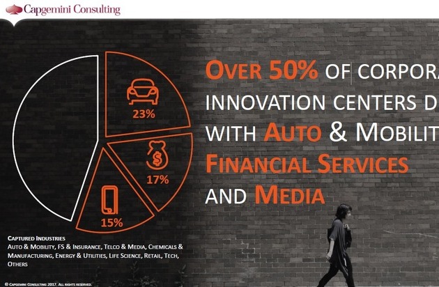 Berlin bleibt mit vier im ersten Quartal 2017 neu eröffneten Innovationszentren unter den Top 10 Städten nach dem Silicon Valley, Singapur, London, Bangalore, Paris und Atlanta und liegt damit noch vor Boston und Shanghai. In Deutschland wuchs die Anzahl der unternehmenseigenen Innovationszentren insgesamt um 24 Prozent auf 78 Zentren. Die Studienautoren unterscheiden bei den Innovationszentren zwischen Labs, die bis zu einem halben Jahr bestehen und vor allem für Prototyping und Geschäftsmodellentwicklung genutzt werden, und Inkubatoren, die bis zu zwei Jahren über die Markteinführung bis hin zur Hochskalierung der Ideen bestehen. Dritte Kategorie sind die sogenannten Acceleratoren, die mit Markteinführung über einige Monate für das Hochskalieren der innovativen Ideen genutzt werden. Über 50 Prozent der Unternehmensinnovationszentren sind Inkubatoren, von denen sich wiederum die Hälfte mit Mobilität (23 Prozent), Finanzdienstleistungen (17 Prozent) oder Medien (15 Prozent) beschäftigen. Innerhalb der verschiedenen Branchen gibt es eine Präferenz für bestimmte Innovationcenter-Typen: Während zum Thema Mobilität größtenteils in Labs gearbeitet wird, nutzen Versicherungs- und Finanzindustrie vor allem Inkubatoren, Medien und Telekommunikation ist das Format der Acceleratoren am nächsten.