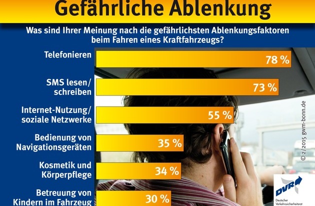 Drei Viertel der Autofahrerinnen und Autofahrer sind der Meinung, dass Telefonieren (78 Prozent) und das Lesen oder Schreiben von SMS (73 Prozent) die gefährlichsten Ablenkungsfaktoren beim Fahren eines Kraftfahrzeugs darstellen. Dies ergab eine repräsentative Befragung, die im Auftrag des Deutschen Verkehrssicherheitsrates (DVR) im November 2015 vom Marktforschungsinstitut Ipsos bei 2.000 Personen über 14 Jahren durchgeführt wurde. An dritter Stelle bei der Einschätzung der Gefährlichkeit rangierten Internetnutzung und soziale Dienste (55 Prozent), gefolgt von der Bedienung von Navigationsgeräten (35 Prozent). Der DVR weist darauf hin, dass nach Schätzung von Experten jeder zehnte Verkehrsunfall durch Ablenkung verursacht wird. Wenn der Blick auf das Display des Smartphones nur zwei Sekunden dauere, lege man bei einer Landstraßenfahrt und einem Tempo von 100 km/h bereits 56 Meter im Blindflug zurück. Der DVR appelliert an alle Verkehrsteilnehmer, Ablenkung beim Fahren möglichst zu meiden.
