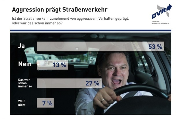 Über die Hälfte der Autofahrerinnen und Autofahrer (53 Prozent) ist der Meinung, dass der Straßenverkehr zunehmend von aggressivem Verhalten geprägt ist. Etwa ein Viertel (27 Prozent) ist der Auffassung, das sei schon immer so gewesen. Dies ergab eine repräsentative Befragung, die im Auftrag des Deutschen Verkehrssicherheitsrates (DVR) im Juni 2016 vom Marktforschungsinstitut Ipsos bei 2.000 Personen über 14 Jahren durchgeführt wurde. Demnach ist Aggression für acht von zehn Befragten ein prägendes Element im Straßenverkehr. Als Beispiele für aggressives Verhalten wurden am häufigsten zu schnelles Fahren genannt (73 Prozent), gefolgt von dichtem Auffahren/Drängeln (67 Prozent) und riskantem Überholen (65 Prozent). Aber auch Regelverstöße wie zum Beispiel die "Missachtung der Vorfahrt" und "ungeduldiges Hupen" stehen weit oben auf der Liste wahrgenommenen aggressiven Verhaltens.