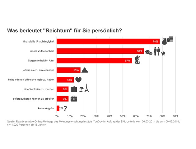 Reich sein - wer möchte das nicht? Reichtum, das bedeutet für fast 80 Prozent der Deutschen finanzielle Unabhängigkeit. Das ist das Ergebnis einer repräsentativen Umfrage im Auftrag der SKL-Lotterie. Aber: Bei zwei Drittel leuchten beim Thema Reichtum nicht nur Eurozeichen in den Augen auf. Sie denken bei dem Thema auch an Dinge, die man sich nicht kaufen kann - wie Gesundheit, Liebe und Zufriedenheit. Einige Losbesitzer werden in der 137. SKL-Lotterie, die am 1. Juni 2015 beginnt, ihre Definition von Reichtum möglicherweise überdenken - denn über 100 Mal besteht für sie die Chance, über Nacht zum (Multi-)Millionär zu werden.