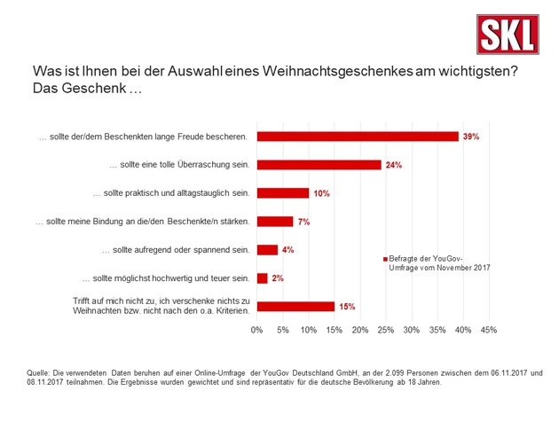 *Quelle: Repräsentative Online-Umfrage des Marktforschungsinstituts YouGov vom 06.11.2017 bis zum 08.11.2017 im Auftrag der SKL-Lotterie zum Thema "Was ist Ihnen bei der Auswahl eines Weihnachtsgeschenkes am wichtigsten?". Befragt wurden 2.099 Teilnehmer. Die Ergebnisse sind gewichtet und repräsentativ für die deutsche Bevölkerung ab 18 Jahren. **Chance auf den Höchstgewinn in der Lotterie: 1 : 500.000; in der Runde 1 : 3.000.000.