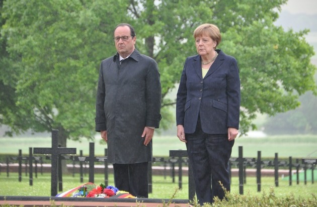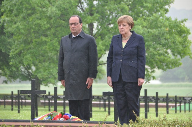 Bundeskanzlerin Angela Merkel und der französische Präsident François Hollande haben heute der Opfer der Schlacht um Verdun auf der deutschen Kriegsgräberstätte in Consenvoye gedacht und Kränze niedergelegt.