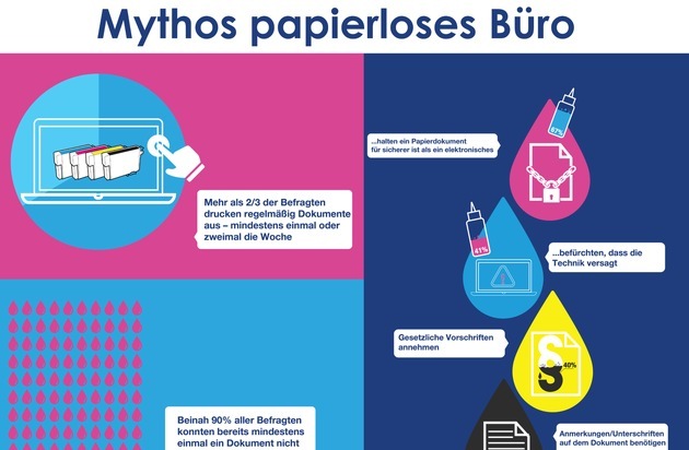 Eine von Epson initiierte Studie zum Druckverhalten von Familien in Deutschland zeigte, dass trotz der starken Verbreitung mobiler Geräte rund zwei Drittel aller Familien mindestens ein- oder zweimal die Woche Dokumente ausdrucken. Gründe hierfür sind neben der Sorge um die Flüchtigkeit elektronischer Dokumente (67 Prozent) auch der Wunsch, Anmerkungen an dem Dokument anzubringen (51 Prozent) sowie bestimmte gesetzliche Vorschriften (40 Prozent). Fehlendes Vertrauen in die Verfügbarkeit der Technologie (40 Prozent) war ein weiterer Grund vieler Befragten, auf Papierdokumente zu setzen. In der gleichen Umfrage stellte sich zudem heraus, dass rund 85 Prozent bereits einmal nicht drucken konnten, weil die Tinte beziehungsweise der Toner leer waren.