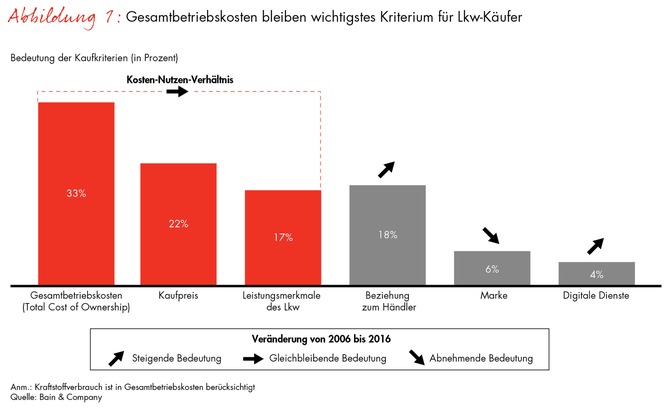 die Effizienz steigernLkw-Kunden in Deutschland und Europa wollen hochwertige Fahrzeuge und Dienstleistungen, um ihre Gesamtbetriebskosten zu optimieren und ihre Transportleistung zu maximieren. Sie sind offen für neue digitale Services und auch bereit, diese zu bezahlen, wenn sie die Ökonomie und Effizienz der Fahrzeuge verbessern. Bei Spediteuren geben vor allem leistungsfähige Komplettlösungen über den gesamten Lebenszyklus hinweg den Ausschlag für den Lkw-Kauf - nicht so sehr günstige Fahrzeugneupreise. Diese Einstellung ist umso ausgeprägter, je größer die Unternehmen und Flotten sind. Das sind einige Ergebnisse der in diesem Jahr zum sechsten Mal durchgeführten Studie "What Matters Most in Europe's Truck Market" der internationalen Managementberatung Bain & Company. Befragt wurden darin mehr als 600 Flottenbetreiber von Nutzfahrzeugen über 6 Tonnen in den zehn größten europäischen Märkten zu ihren Kaufkriterien, ihrer Markenloyalität und ihrer Sicht auf digitale Dienste.