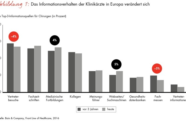 Für Medizintechnikunternehmen wird es damit schwieriger, in Kliniken die richtigen Ansprechpartner zu adressieren und die Entscheidungsprozesse für Anschaffungen nachzuvollziehen. Das bisherige partnerschaftliche Verhältnis zwischen Chirurgen und Herstellern hat sich gelockert. Die Vertriebsmitarbeiter der Medtech-Unternehmen sind für Ärzte nicht mehr die wichtigste Informationsquelle, um neue diagnostische oder chirurgische Methoden sowie Verfahren kennenzulernen und auszuprobieren. Ihre Bedeutung ist im Vergleich zur letzten Erhebung vor drei Jahren gesunken. Heute nutzen die Ärzte ebenso häufig Fachzeitschriften und medizinische Fortbildungen, um ihr Wissen aufzufrischen (Abb. 1).