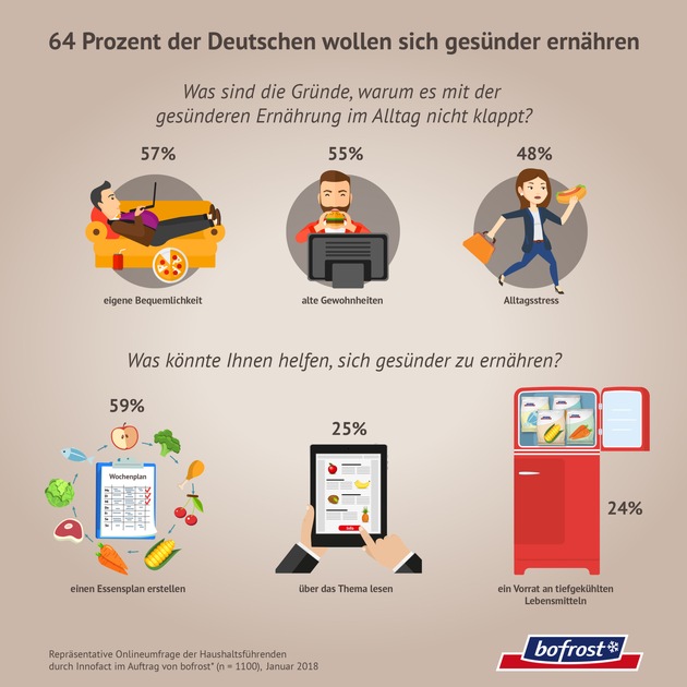 Als größte Hürden für die dauerhafte Umsetzung ihrer Vorsätze sehen die Deutschen die eigene Bequemlichkeit (56,5 Prozent), hartnäckige alte Gewohnheiten (55,3 Prozent) und den Alltagsstress (47,9 Prozent). Hier können Tiefkühl-Heimdienste wie bofrost* durch den persönlichen Service bis an die Haustür und die geschlossene Tiefkühlkette Entlastung bieten.