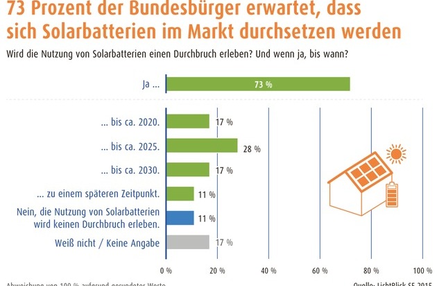 Die Mehrheit der Deutschen ist sich sicher: Die Solarbatterie steht vor dem wirtschaftlichen Durchbruch. 73 Prozent der Bundesbürger erwartet, dass sich die Batterie, mit der Verbraucher den tagsüber lokal erzeugten Sonnenstrom speichern und abends nutzen können, im Markt durchsetzen wird. Immerhin 17 Prozent gehen davon aus, dass sich Solarbatterien bereits innerhalb der nächsten fünf Jahre rechnen. Jeder Fünfte - umgerechnet über 13 Millionen erwachsene Verbraucher - haben bereits über die Anschaffung einer Solarbatterie nachgedacht. Dies geht aus einer repräsentativen Umfrage hervor, die das Meinungsforschungsinstitut YouGov Anfang Juni im Auftrag des Energie - und IT-Unternehmens LichtBlick durchgeführt hat.