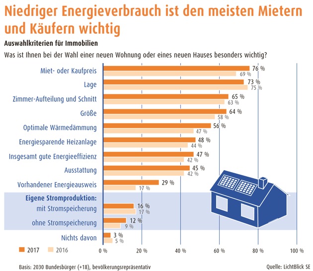"Bei hohen Immobilienpreisen sind eine gute Energiebilanz und damit geringere Energiekosten relevante Kriterien für Mieter und Käufer. Damit bleibt auch die eigene Stromproduktion mit einer Solaranlage auf dem Dach und einem Stromspeicher im Keller interessant. Denn so können Haushalte ihre Energiekosten reduzieren und sich unabhängiger machen", sagt Gero Lücking, Geschäftsführer Energiewirtschaft von LichtBlick.