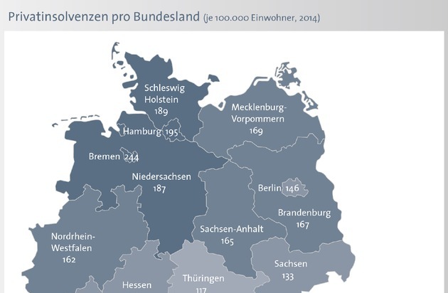 Bei der differenzierteren Betrachtung nach Privatinsolvenzen, bezogen auf die Einwohnerdichte, zeichnet sich indes ein starkes Nord-Süd-Gefälle ab. Demnach verbuchen insbesondere die nördlichen Bundesländer eine hohe Zahl an Privatpleiten - allen voran Bremen mit 244 Fällen je 100.000 Einwohner. Es folgen Hamburg mit 195 Privatinsolvenzen pro 100.000 Einwohner, Schleswig-Holstein (189) und Niedersachsen (187). Am wenigsten Insolvenzen ereigneten sich 2014 in Baden-Württemberg mit 100 Insolvenzen je 100.000 Einwohner und Bayern (103). Auch in Thüringen (117 Fälle je Einwohner), Hessen (127) und Sachsen (133) lagen die Werte unter dem Bundesdurchschnitt von 143 Insolvenzen je 100.000 Einwohner.