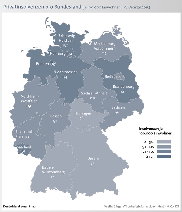In den ersten neun Monaten des Jahres setzt sich ein Trend der vergangenen Jahre fort. Bei den Privatinsolvenzen in Deutschland zeigt sich ein ausgeprägtes Nord-Süd-Gefälle. Am meisten Privatinsolvenzen gab es demnach mit 165 Insolvenzen je 100.000 Einwohner in Bremen. Es folgen Niedersachsen und das Saarland mit 134 Privatinsolvenzen je 100.000 Einwohner. Auch Hamburg (132) und Schleswig-Holstein (130) liegen deutlich über dem Bundesdurchschnitt von 99 Privatinsolvenzen je 100.000 Einwohner. Positiver ist die Situation im Süden Deutschlands, der weniger von Privatinsolvenzen betroffen ist. Hier schneiden Baden-Württemberg und Bayern (je 74) und mit etwas Abstand Thüringen (78) am besten ab.