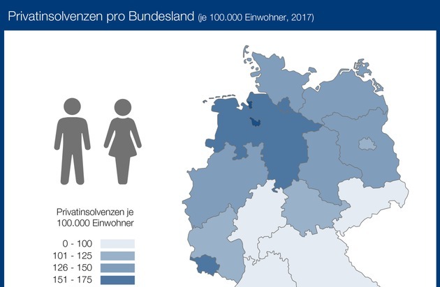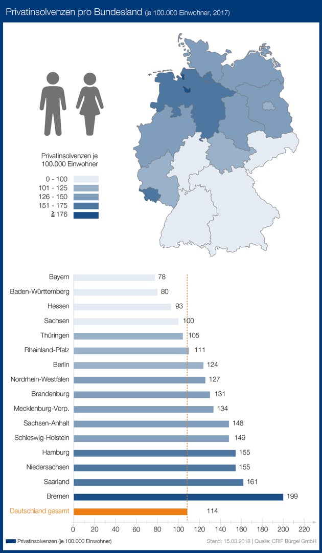 Bremen war 2017 erneut Insolvenzhochburg. Auf 100.000 Bürger gerechnet waren 199 zahlungsunfähig. Beim Vergleich der Bundesländer liegt das Saarland mit 161 Insolvenzen auf Platz zwei. Es folgt das bekannte Nord-Süd-Gefälle bei den Privatinsolvenzen. Niedersachsen und Hamburg (je 155 Insolvenzen je 100.000 Einwohner) sowie Schleswig-Holstein (149) liegen über dem Bundesdurchschnitt (114). Am wenigsten Privatinsolvenzen meldete im Jahr 2017 Bayern (78 Fälle je 100.000 Einwohner).
