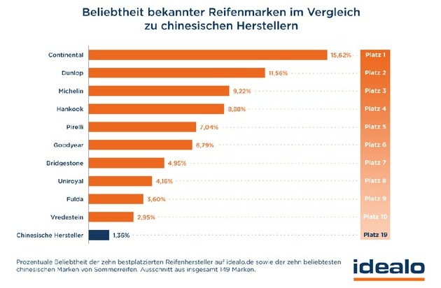 * Premiummarken nach Beliebtheit auf idealo.de: Continental, Dunlop, Michelin, Hankook, Pirelli, Goodyear, Bridgestone, Uniroyal, Fulda, Vredestein. Chinamarken nach Beliebtheit auf idealo.de: GoodRide, Wanli, Sunny, Infinity, Linglong, Sonar, Blackstone, Chengchan, Triangle, Maxxis. ** Stand: 27.02.2015