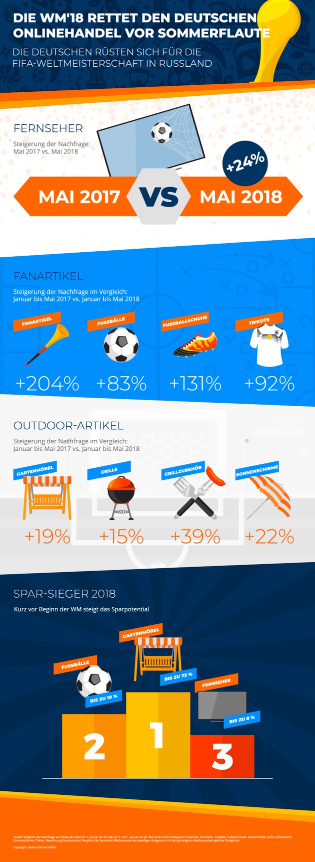 Schon kurz vor Beginn der diesjährigen Fußball-Weltmeisterschaft macht sich wieder das WM-Fieber bei den Deutschen bemerkbar und die Vorbereitungen laufen auf Hochtouren: Schnell noch einen größeren Fernseher kaufen, den Garten herrichten und ausreichend Fanartikel bereitstellen. Die Shopping- und Vergleichsplattform idealo hat das Shopping-Verhalten der Deutschen im Vergleich zum letzten Jahr analysiert und erkannt: Die Deutschen rüsten sich für die Fußball-Weltmeisterschaft 2018 und pushen mit ihren Vorbereitungseinkäufen den deutschen Onlinehandel.