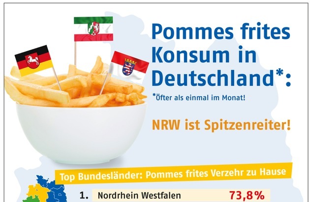 Top Bundesländer im Pommes frites Verzehr: 1. Nordrhein Westfalen 73,8 % 2. Hessen 59,1 % 3. Niedersachsen / Bremen 58,1 % Schlusslicht: Thüringen 32,0 %
