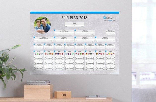 Pünktlich zur diesjährigen WM überrascht der Online-Fotoservice Pixum mit einem praktischen Spielplaner. Ob als kostenloser Download oder als individualisiertes Pixum Fotoposter in 60×40 cm - mit dem Pixum Spielplan haben Fußballfans alle Spiele im Blick. Um den Planer als individuelles Fotoposter bestellen zu können, bietet Pixum verschiedene Design-Vorlagen im eigenen Online-Designer auf https://www.pixum.de/themenwelt/sport an.