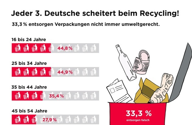 Wie die Umfrage des dvi zeigt, scheitert mit über 33,3 % mehr als jeder dritte Deutsche immer wieder beim Recycling. Auch wenn die Gründe unterschiedlich sind, aus Sicht des dvi muss es "das Ziel sein, die Quote derjenigen, die alle gebrauchten Verpackungen richtig entsorgen, auf über 80 % zu bringen. Sonst gehen zu viele wertvolle Verpackungen mit dem Restmüll in die Verbrennung, werden zum Störfaktor für die Materialströme des Recycling oder belasten die Umwelt", so Reiner. Bedenklich sind für den dvi-Vorstandsvorsitzenden vor allem die Ergebnisse bei den 16 - 34-Jährigen, wo die Quote bei nur 55,2 % liegt. Hier offenbaren sich scheinbar massive Grundlagendefizite. "Ein gutes Viertel der Jahrgänge ab 1983 hat große Informations- und Wissensdefizite, wie und wo gebrauchte Verpackungen gesammelt werden. Die Aufklärungsarbeit der 90er-Jahre zur Mülltrennung hat diese Generation offensichtlich nicht mehr erreicht. Hier gibt es dringenden Handlungsbedarf."