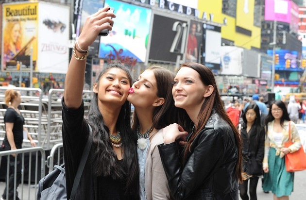 Das Finale von "Germany´s next Topmodel - by Heidi Klum" steigt zum ersten Mal in New York. Die drei Finalistinnen Anuthida, Vanessa und Ajsa (v.l.) machen zur Erinnerung ein Selfie am Times Square.