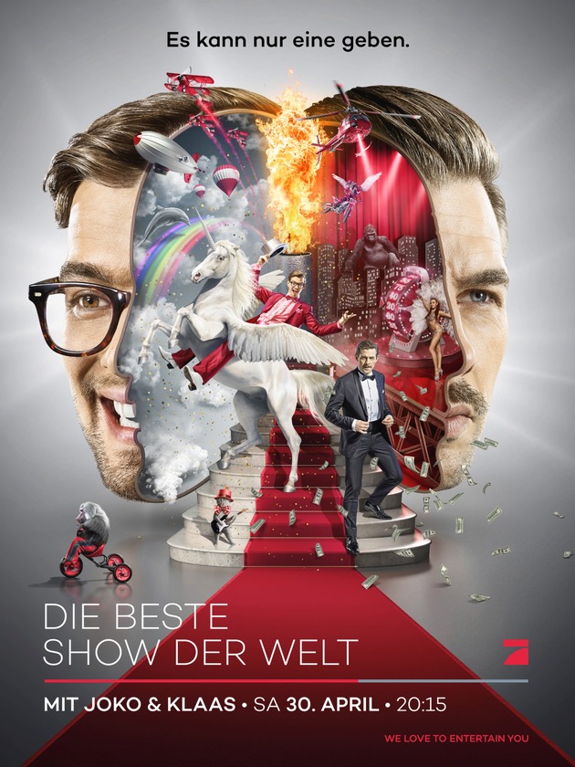 Zwei Kontrahenten, eine Bühne: In insgesamt acht eigenständigen Shows in der Show buhlen Joko und Klaas um die Gunst des Publikums und feiern das Fernsehen. Jede Sendung wird zum Quoten-Duell zwischen den beiden TV-Rivalen: Im Wechsel präsentieren sie ihre ganz eigenen Vorstellungen von erstklassigem Entertainment. Über Quotenhit oder Megaflop entscheidet die ehrlichste Jury Deutschlands: Das Publikum im Studio. Per Fernbedienung küren sie am Samstagabend auf ProSieben "DIE BESTE SHOW DER WELT".