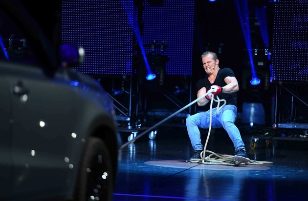 Spiel 1. "Autos ziehen": Wer beweist Abschlepp-Qualitäten und zieht ein Auto schneller an einem Seil durchs Studio? Mucki-Mann Hambüchen gewinnt und geht mit 1:0 in Führung.