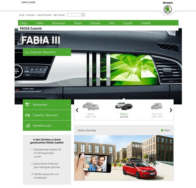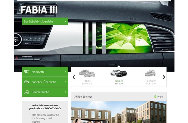 - Clevere Merkzettel-Funktion bietet echten MehrwertIn drei Schritten zum passenden Zubehör: SKODA macht es möglich. Im neuen Onlineportal unter https://zubehoer.skoda-auto.de/ und auf www.skoda-auto.de finden Kunden für alle Modelle der tschechischen Traditionsmarke ebenso praktische wie preisgünstige Produkte, die den Alltag noch leichter, noch komfortabler oder ganz einfach noch schöner machen. Durch die neue Web-Anwendung können Interessenten das umfangreiche SKODA Zubehör virtuell erleben. Und dank der übersichtlichen Menüführung und dem cleveren Merkzettel wird die Suche zum Kinderspiel.