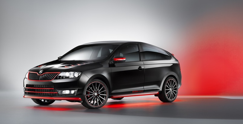 Der SKODA Atero trägt eine Lackierung im Ton Black-Magic Metallic, rotes Zubehör (Wing, Spoiler, Schwellen) ist in Corrida-Rot gehalten; rote Konturen umlaufen den Kühlergrill, den Lufteinlass und den Diffusoreinsatz. Im Innenraum sorgt die rote Innenbeleuchtung für sportliche Stimmung, dazu setzt eine Ambientebeleuchtung mit LED-Spots Highlights. Ein Audioverstärker mit 1.800 Watt Leistung steuert 14 Lautsprecher an - allein der Subwoofer, im Kofferraum platziert, wandelt bis zu 400 Watt in Schalldruck um.