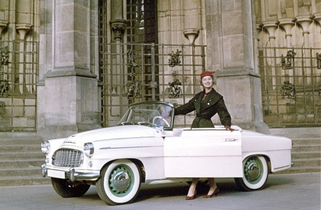 Im September 1957 zeigte der größte tschechische Automobilbauer den mehr als 1,6 Millionen Besuchern der dritten tschechoslowakischen Maschinenbau-Ausstellung in Brünn ein besonderes Highlight: den neuen Roadster SKODA 450. Das Serienmodell lehnte sich eng an die Studie SKODA 440 Roadster an, die der Automobilhersteller ein Jahr zuvor an gleicher Stelle der Öffentlichkeit vorgestellt hatte. Im Oktober 1957 sorgte der SKODA 450 dann auch außerhalb der Grenzen der ehemaligen Tschechoslowakei für Furore: Bei seinem Debüt auf der Automobilmesse in London stand der Roadster gemeinsam mit der amtierenden Miss USA, Charlotte Sheffield (1936 - 2016), im Rampenlicht. Der renommierte Fotograf Vilém Heckel setzte den SKODA 450 und die Schönheitskönigin gemeinsam in Szene. Diese Bilderserie zählt bis heute zum goldenen Fundus tschechoslowakischer Werbefotografie.