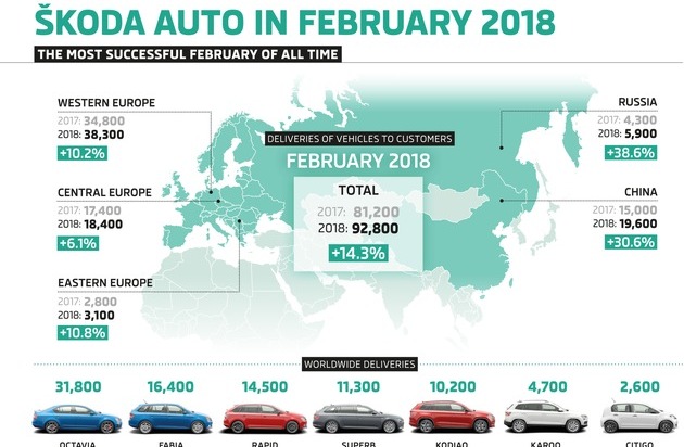 - SKODA AUTO liefert im Februar 92.800 Fahrzeuge an Kunden aus
