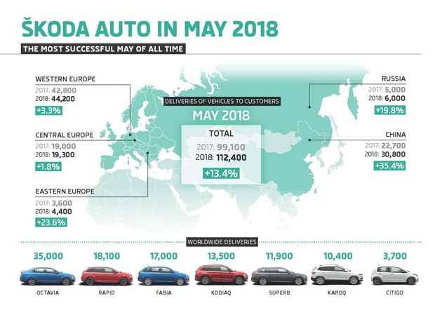 In Westeuropa steigen die Auslieferungen im Vergleich zum Vorjahreszeitraum um 3,3 Prozent auf 44.200 Fahrzeuge (Mai 2017: 42.800 Fahrzeuge). Auf dem größten europäischen Einzelmarkt Deutschland verzeichnet SKODA 15.100 Auslieferungen an Kunden (Mai 2017: 15.500 Fahrzeuge; -2,9 %). Besonders stark zulegen kann der tschechische Automobilhersteller in Frankreich (3.000 Fahrzeuge; +32,4 %), Spanien (2.800 Fahrzeuge; +16,5 %), Schweden (2.000 Fahrzeuge; +22,9 %) sowie in Finnland (1.100 Fahrzeuge; +14,0 %) und Griechenland (400 Fahrzeuge; +20,1 %).